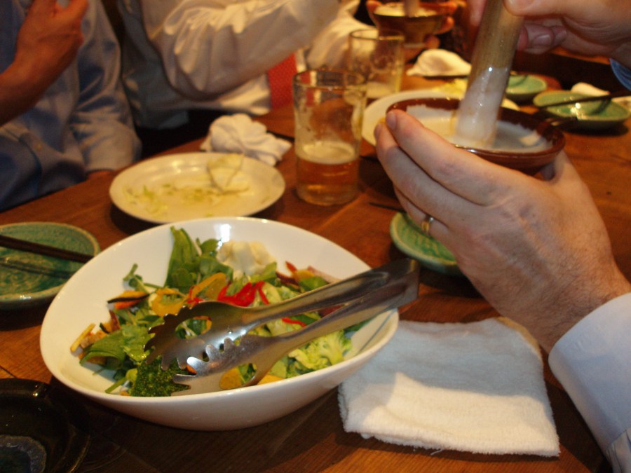 17 vegetable salad served with raw egg dressing that you mix with mortar/pestle on the side