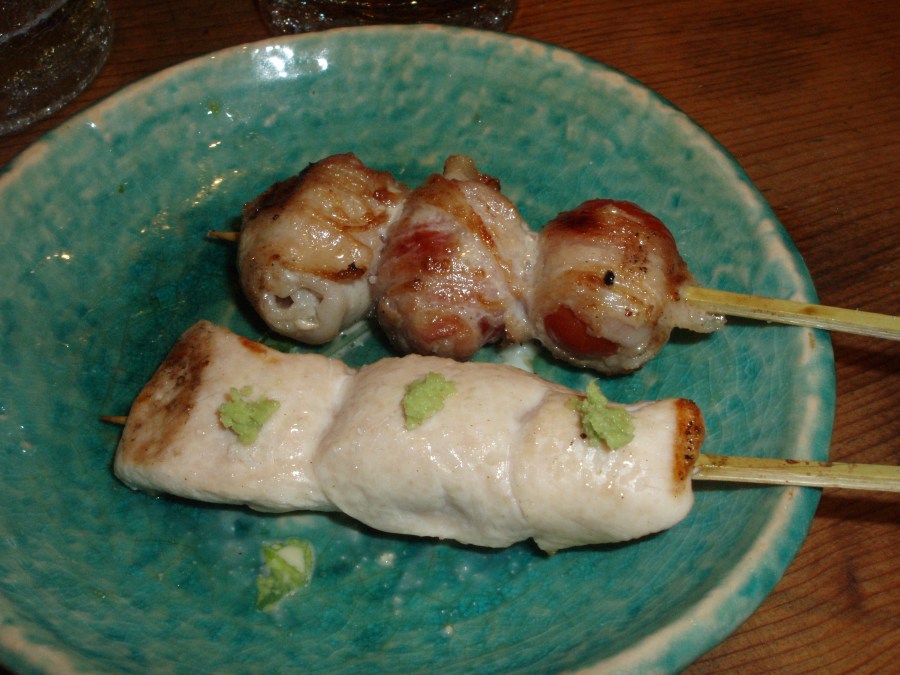 Sasami (chicken breast) with dolop of fresh wasabi and Pork wrapped wrapped tomatos