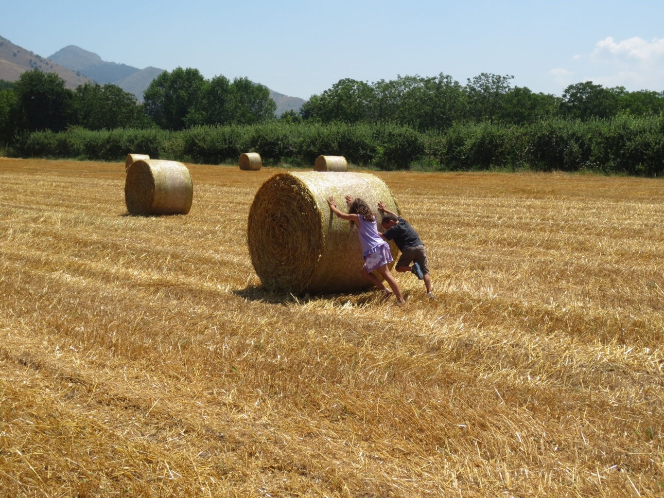 At 11am we hopped back in the car heading for our second pit stop. As we wound through the small country roads we passed a lot of large bales of hay. Thinking it would be cute to get some pics of the kids with hay, we pulled over. D went running for the field, didn’t realize the thickness of the brush, and when he stepped off the street and onto the fields (which looked level) he fell flat on his face and sunk about 2 feet deep. He quickly got up laughing and Paul lifted Miss M and D over the brush and into the field. The kids were having fun working together to slowly roll the bale of hay. D was happy to be out of the car and went running full steam ahead – in typical D style – charging at a bale of hay. He thought he’d be able to roll the bale faster with his momentum, but instead he ricocheted off the bale and landed on the ground with a splat. Completely clotheslined. Grandma and I were standing on the side of the road watching the whole thing unfold. It was hysterical. We then realized that the brush had a lot of “leaves of three” so we quickly wiped him down with antibacterial wipes….thank goodness no poison ivy.