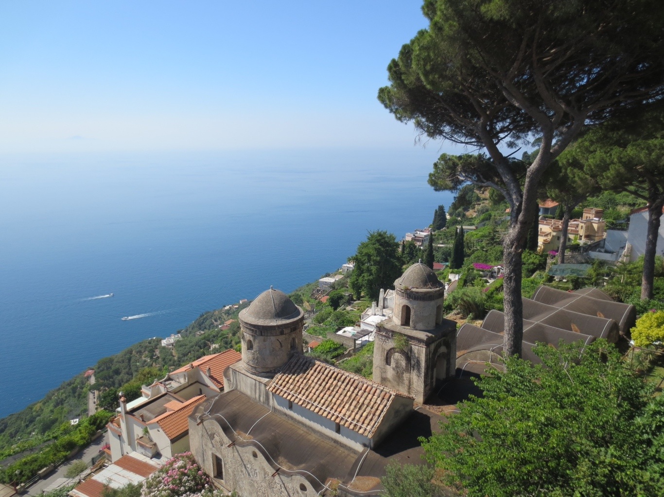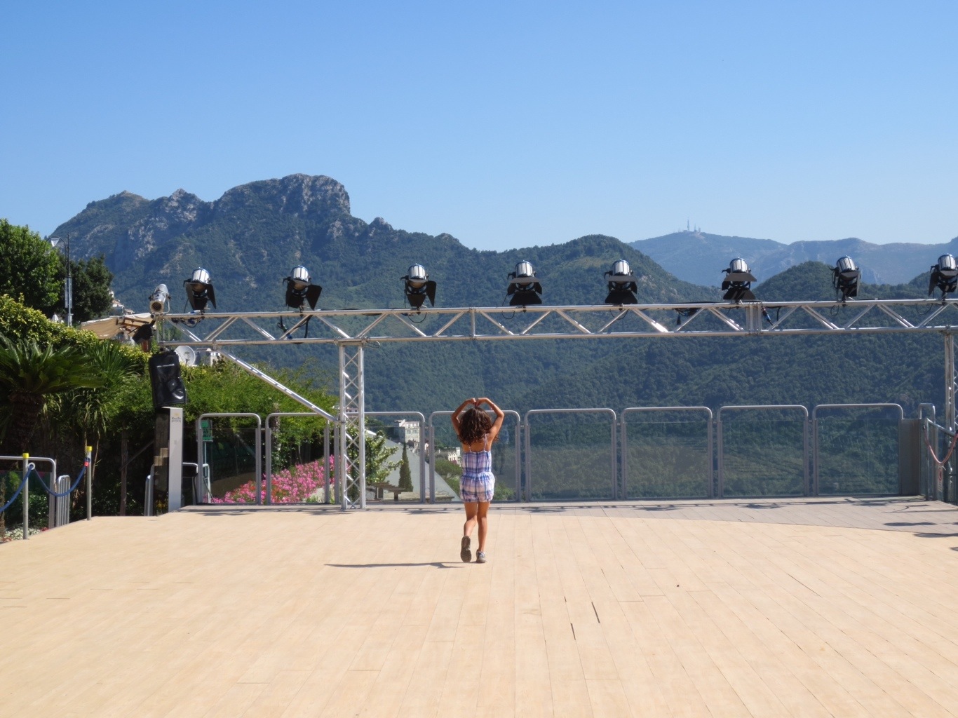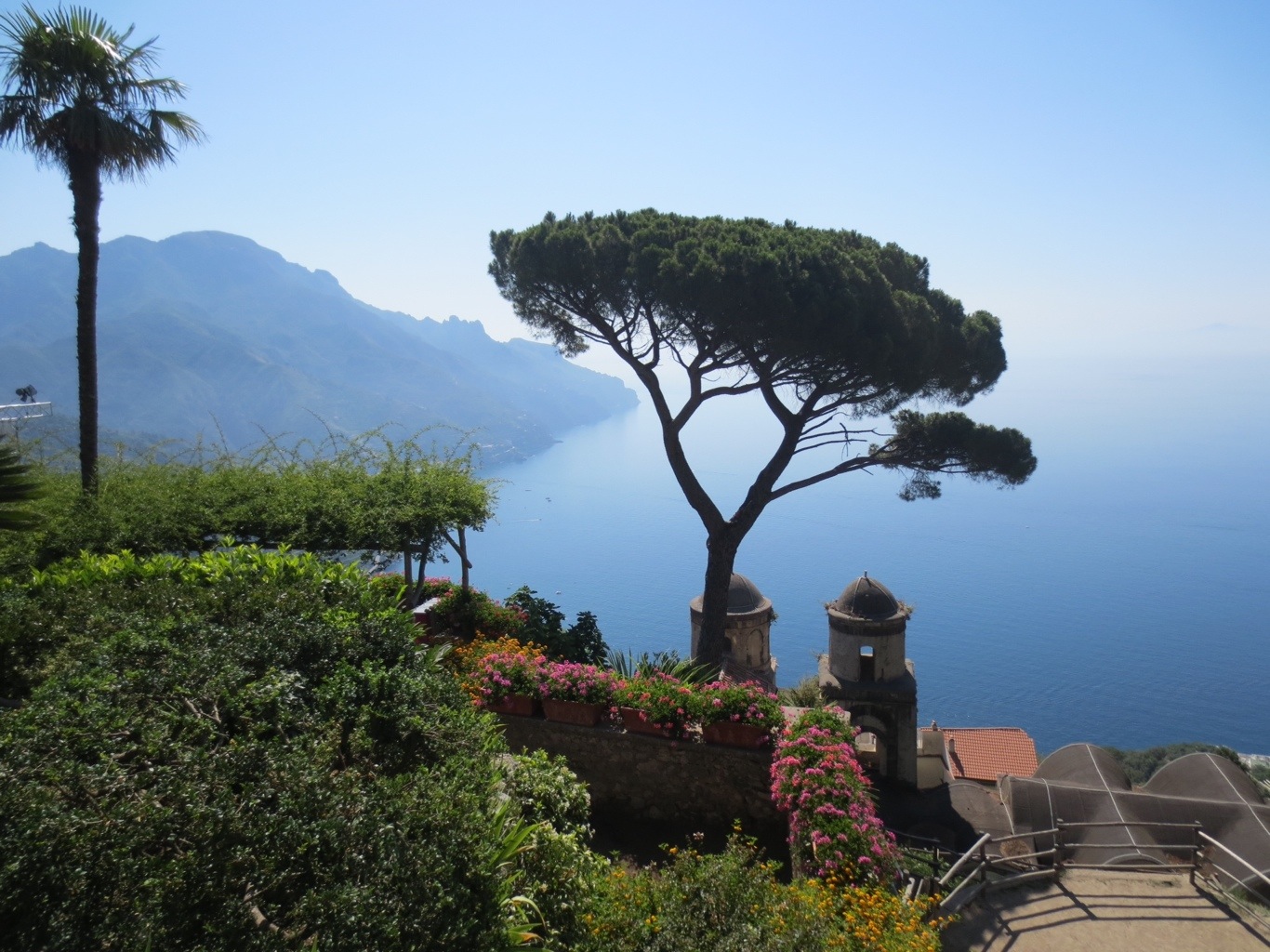 (July 5) Today we hired Tony, our driver from yesterday, to bring us to Ravello – a town on the Amalfi coast which is different than Sorrento, Positano, Amalfi, Minori and others because it is high up in the mountains. We spent a few hours wandering around town, browsing the shops and marveling at the views. A much different perspective than what you’d get on the bus or from the shoreline. Paul brought us to Villa Rufolo (www.villarufolo.it) which was stunning. The gardens and historic architecture are a shadow of what it was in the 13th century, but it’s worth the trip to marvel at the varieties of plants, plum trees, nut trees and vistas. Composer Richard Wagner was entranced with this area, and we enjoyed spending time dancing across a stage which was set up for the Ravello jazz festival. The backdrop of the stage is the sky with a panoramic view of neighboring towns and the sea down below. Truly the most beautiful site to see. Of course we shopped in that area as well and I purchased a beautiful ceramic plate.
