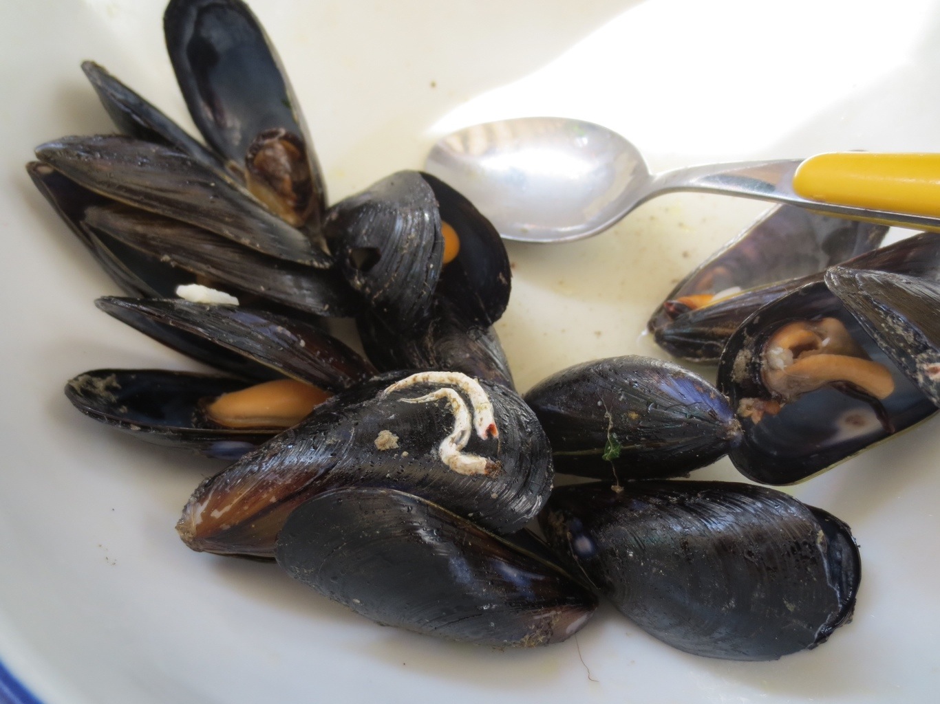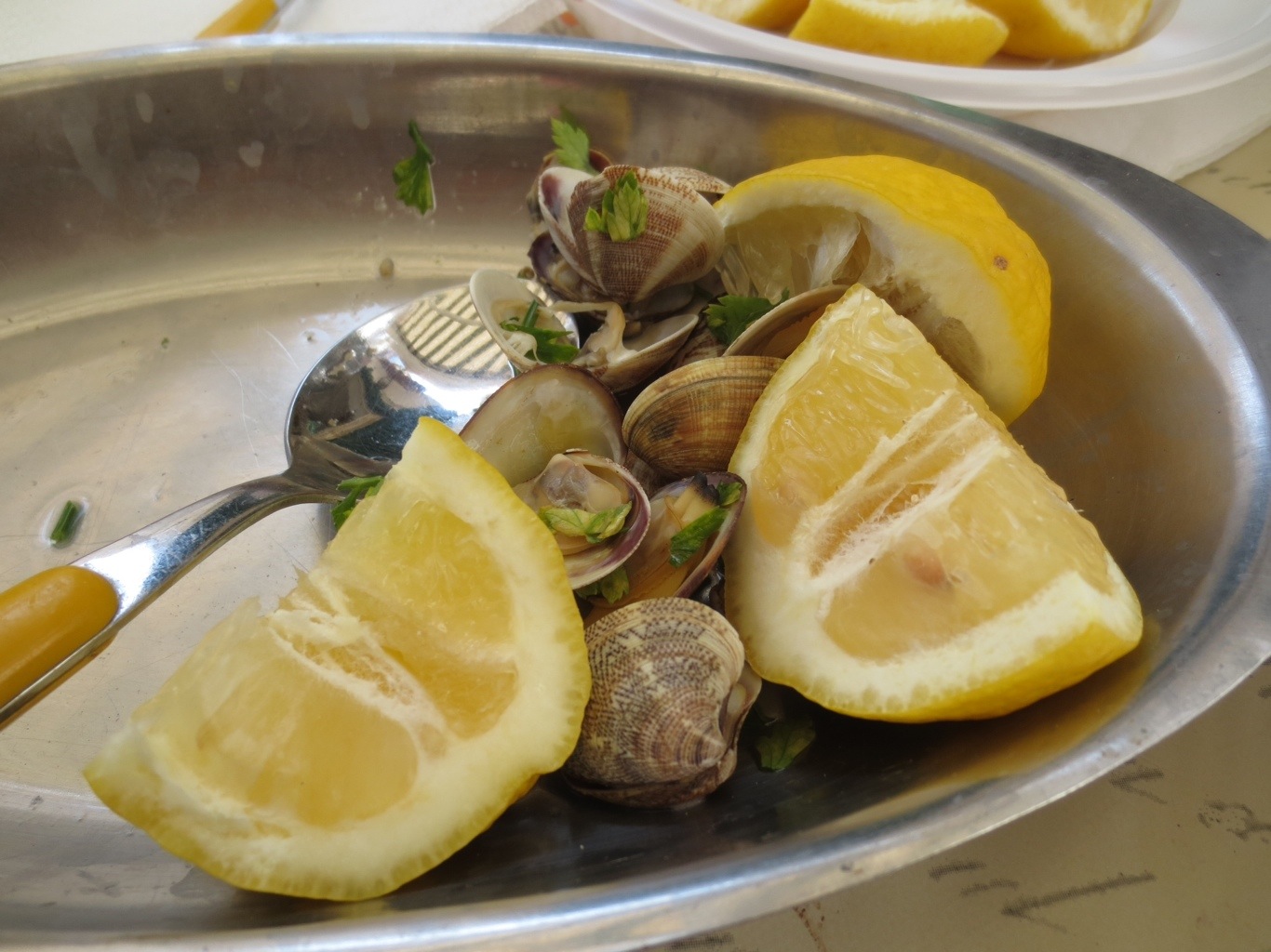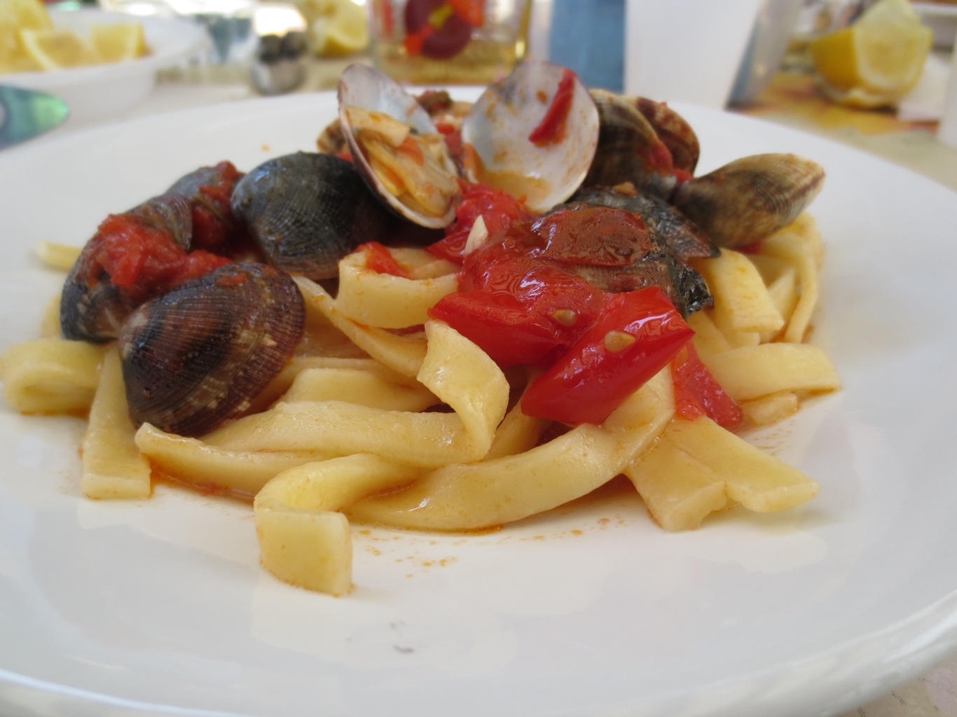 In Cetera: Antonella’s father, Vincenzo, was a fisherman, and also the chef on the boat, so he was very happy to cook lunch for us. Vincenzo prepared a salad of lettuce and tomatoes dressed with olive oil and lemon, crusty bread, vongole (clams), mussels in a lemony broth, and pasta with fresh tomatoes with vongole. Everything was so delicious. The kids ate hot dogs, pasta with butter, yogurt, and cream cheese on Italian bread. Of course there was limoncello, white wine, and for dessert watermelon and a pear and ricotta tart that we brought from Bar Del Risto.
