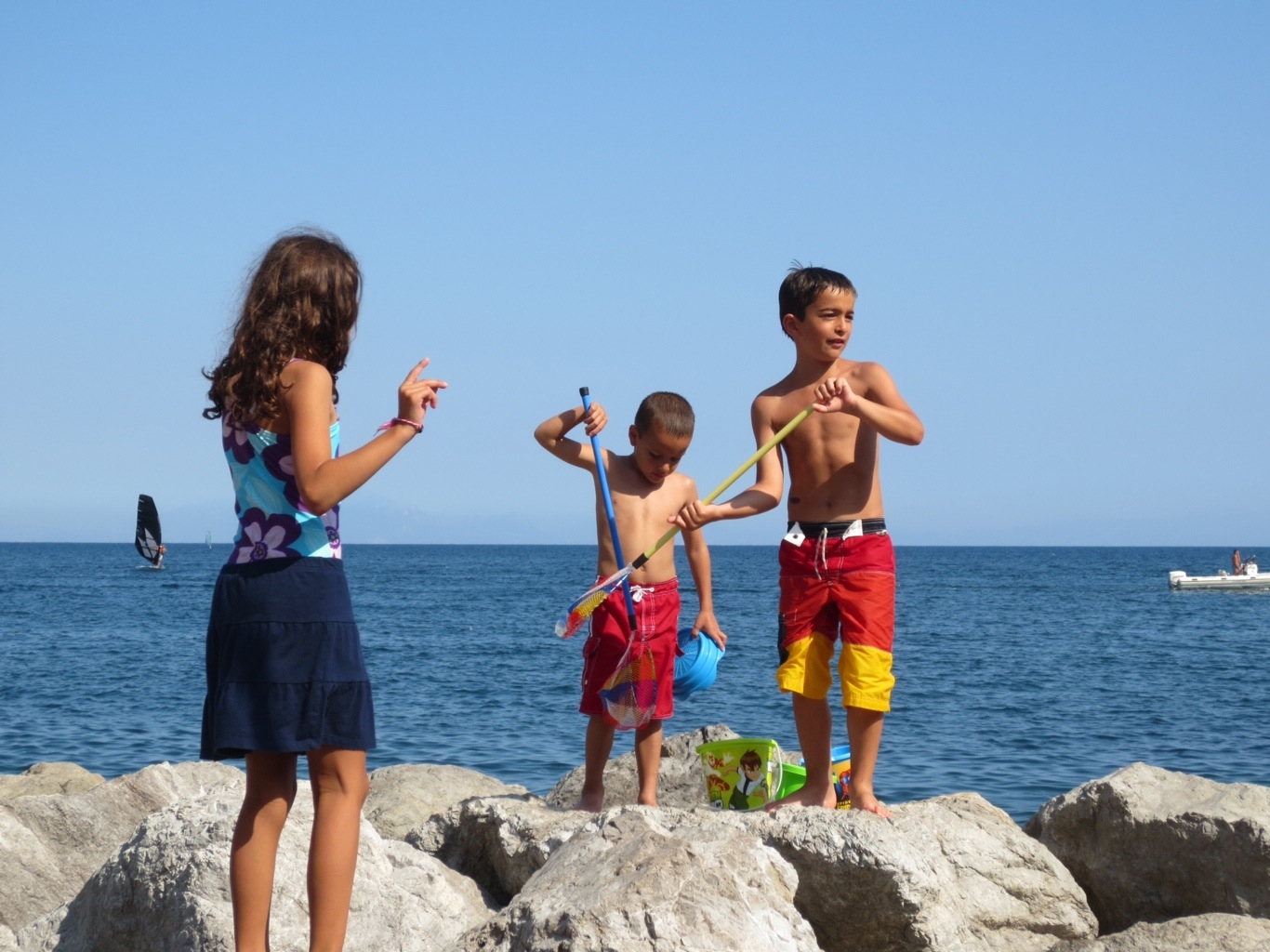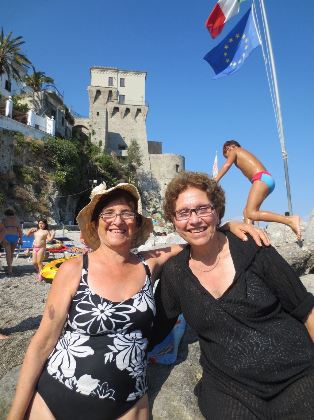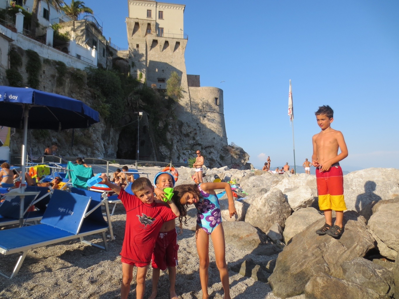 The kids had a blast playing on the beach, the water was warm and clear with little fishies swimming around us. And D joined the adults in jumping off a big rock into the deep bay of Salerno, quickly made friends with other little Italian boys on the beach, went hunting for crabs between the rocks, and loved swimming with the snorkel mask.
