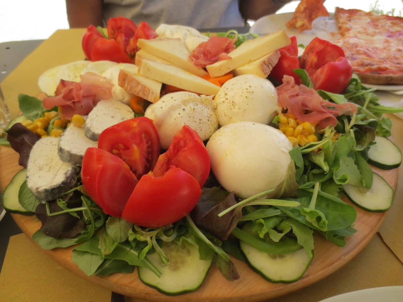 Lunch in Orvieto at il Gusto where the kids had pasta with butter, Papa had pizza margherita, and the rest of us enjoyed the best antipasto of the trip. See pic below. Three balls of burrata cheese, buffalo mozzarella, goat cheese, a fourth cheese, whole bright red tomatoes, cucumbers, corn niblets, carrots, and a small amount of a cooked smoked ham, all on a bed of arugula.