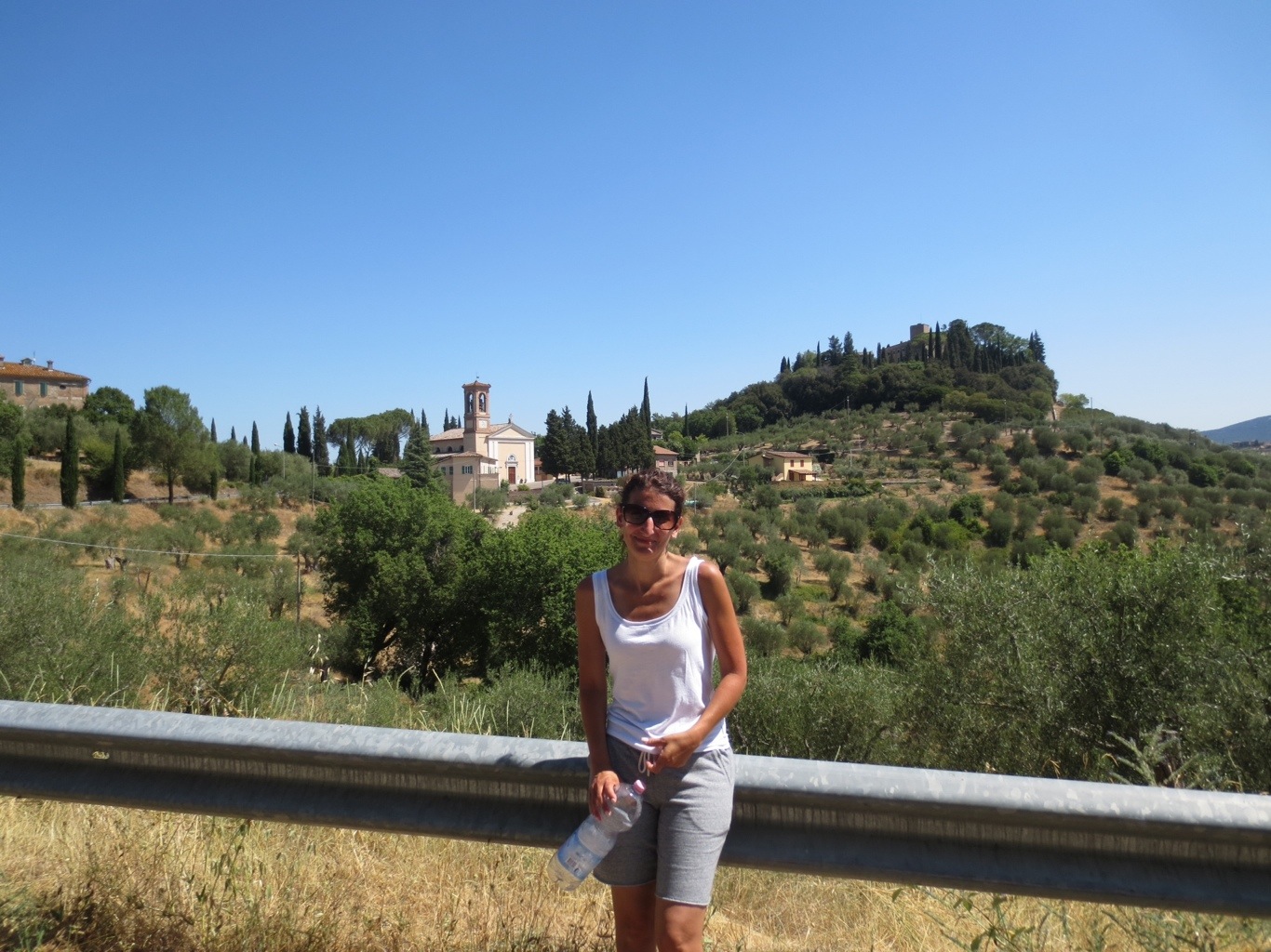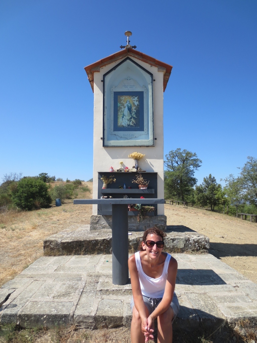 Today (July 10) the kids spent the morning in the pool at the villa while Paul and I went on a hike. It took us 45 minutes to go up Monte Penna (which translates roughly to feather in the cap.) We started at the villa, walked past the road that brings you to the center of town, and followed the path up, up and up. The road was rocky and vertical, we passed the town cemetery (which were all above ground mausoleums) and signs requesting that people do not pick the mushrooms, asparagus and other items “of the soil” while walking the trail. At the peak there was a small shrine to the virgin Mary with flowers and someone left a note of prayers as well. The view was spectacular – 360 degree view of the Umbrian countryside including Lake Trasimeno. Took about 20 minutes to walk back down, and then we took a dip in the pool before lunch.