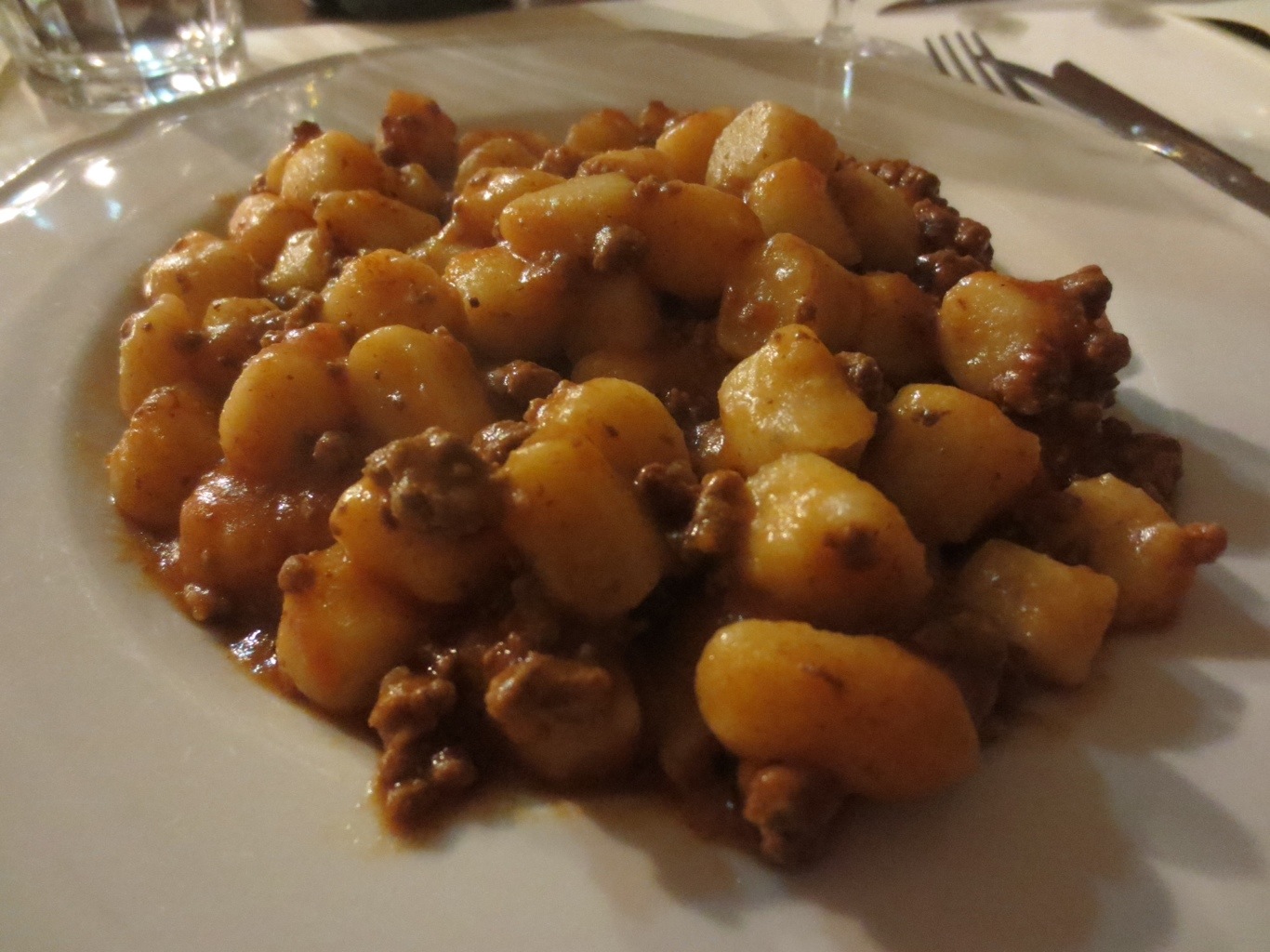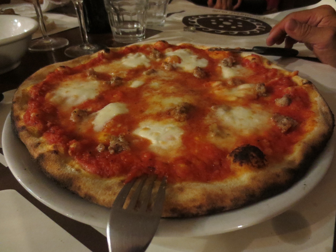 Dinner in Perugia at Al Mangiar Bene…very good. The bread was very dense and flavorful unlike the Tuscan bread that we’ve been having which is without salt or leavening agents in it. Paul and Papa each devoured a Pizza Perugina (Both with sausage, but Paul’s with buffalo mozzarella vs regular mozzarella) and Paul repeatedly exclaimed that it was one of the best pizzas of his life. My gnocchi with chinagale (boar) was good, and I ate the entire plate, but I’ve had better gnocchi. Miss M loved her pizza margherita, and Grandmas panzanella salad was a bit odd with breadcrumbs in the salad versus pieces of bread as we expected. We had an antipasto plate, and an insalate caprese which was a winner because of the buffalo mozzarella. The wine was Grechetto Colli Martani – DiFilippo 2011 – which was excellent. Only issue was the heat. They had air conditioning, but maybe it was because the place was crowded or the pizza oven churning out pizzas at a rapid pace, but we were very warm in there.