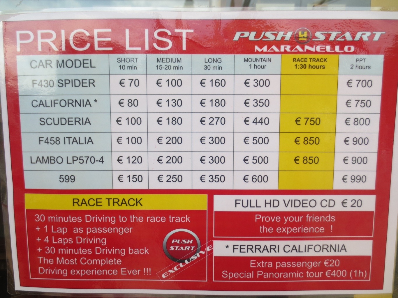 Then back in the car for 90 minutes to drive to pit stop number 2: the Ferrari Museum. The Ferrari Museum was very cool…a lot of old and new cars to look at, helmets, trophies, a video on the plant where the employees work, etc. Separate from the Museum, there are lots of places where you can pay $$$$ to drive a Ferrari…see picture of prices/rates below. We took some pictures sitting in the Ferraris and Lamborghinis before getting on the road again.