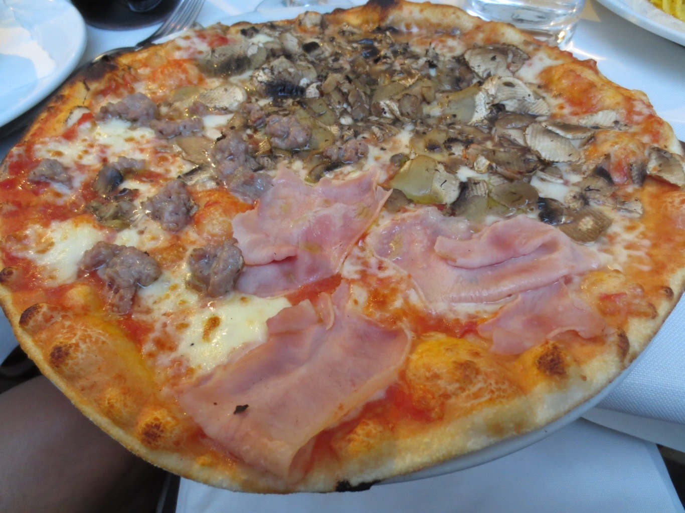 Papa, D and Miss M all had spaghetti carbonara, Grandma had pizza with grilled eggplant, Paul had “4 formaggi speck e grana” which was pizza with tomato, mozzarella, fontina, pecorino, emmetal, speck and grana. I had “4 staggioni” which means 4 seasons: tomato, mozzarella, prosciutto, mushrooms and sausage.