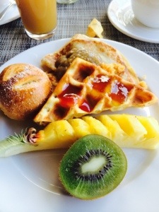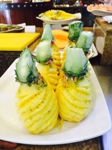 But the highlight of breakfast was the pineapple. A tour guide on the bus ride last night told is that the locals eat their pineapple with chili and salt, so Paul befriended a member of the waitstaff who was happy to introduce him to this local treat. The green chili paste on pineapple was very spicy but yummy, while the sweet chili (red) was also good!