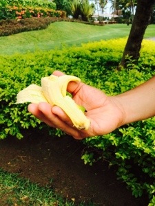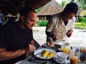 New items we tried at the hotel’s breakfast buffet today: makachia, a light and fluffy Mauritian style beignet flavored with coconut; vanilla + papaya jam and guava jam on crepes, and mini bananas.