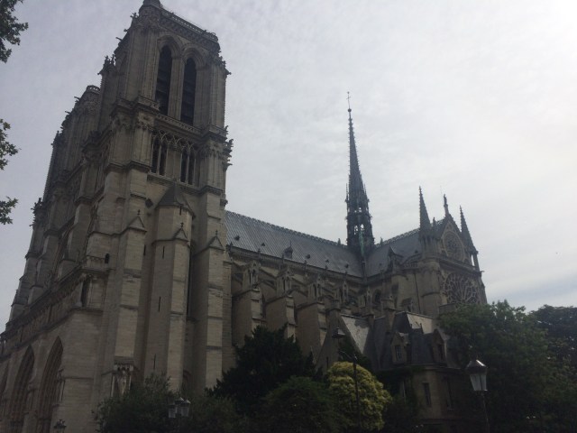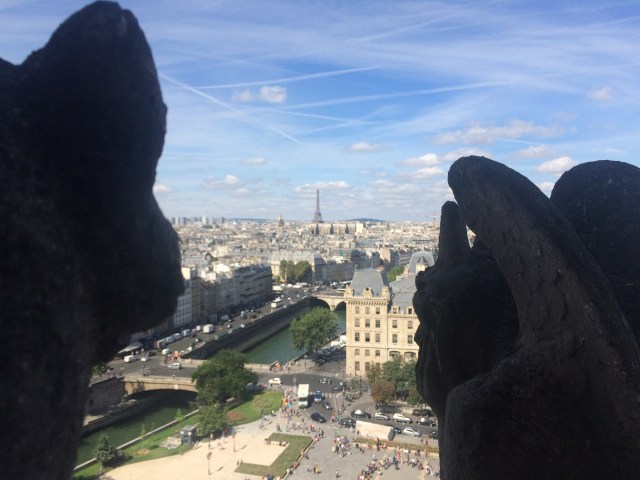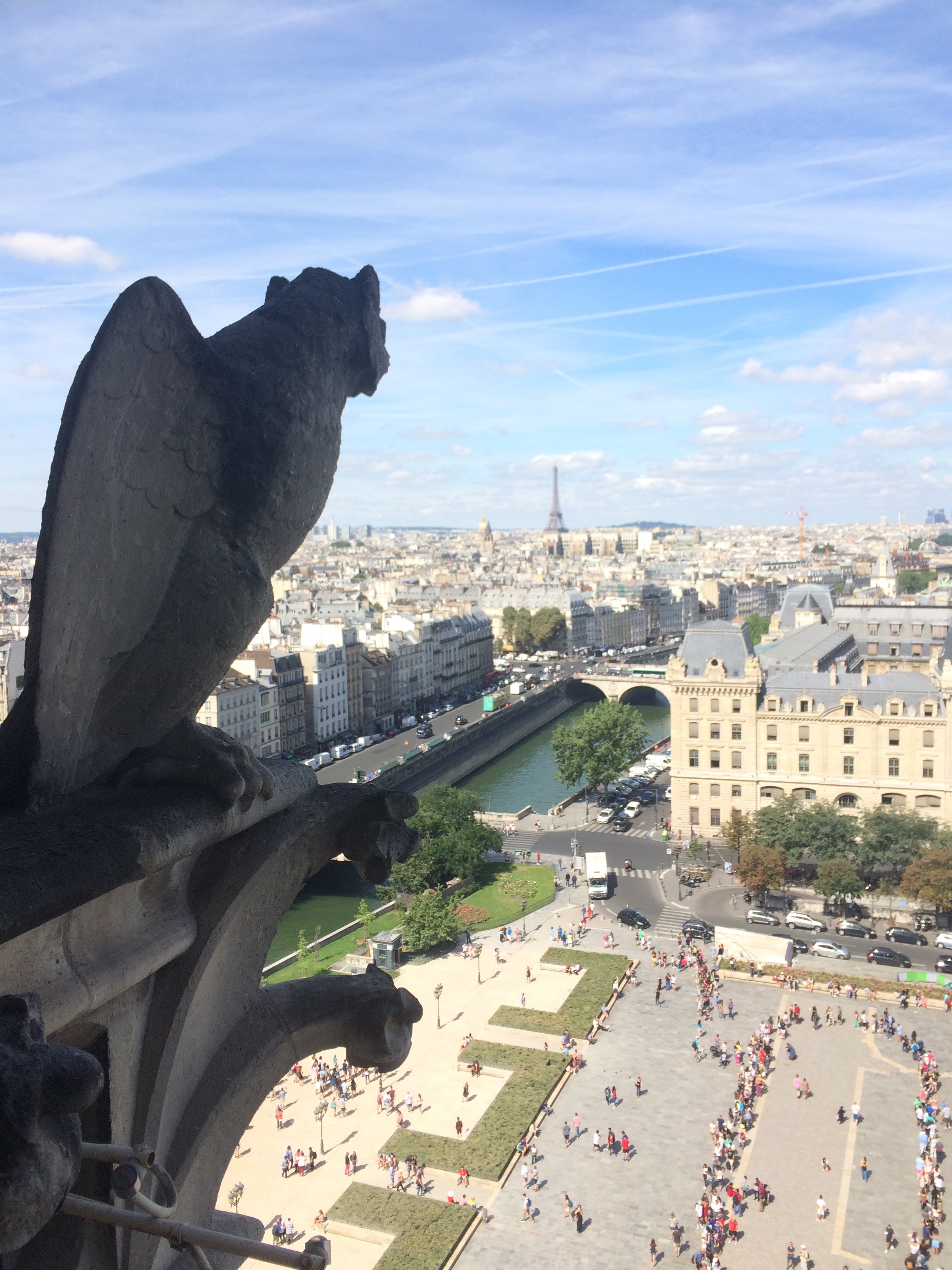We spent the morning at Notre Dame – walked right in when it opened. And then spent 90 minutes in line to visit the bell tower. This was my third time at Notre Dame, but first time up the tower so I was determined! The kids enjoyed it…D especially liked the narrow winding stairs and Paul was excited to see the gargoyles up close. By the time we were done with the bell tower, the line stretched through the plaza and back in order to get into the church.