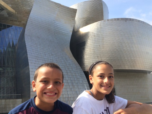 In general, I’m not a fan of buses. Don’t care to ride them, even if it’s to the neighboring town for a football game. But in Europe, the scenery trumps all that. With Karen not feeling well, the kids and I walked to the bus station and hopped on for a 1 hour trip to Bilbao. The ride was beautiful, as the highway weaved through the mountains passing farms and lots of grazing animals. The final approach to Bilbao was pretty industrial, but once we got off the bus, and started walking, the scenery changed. We passed the beautiful and relatively new soccer stadium before finding our way to the river walk that led us to the Frank Gerhy designed Guggenheim Museum.