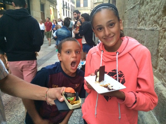 For dinner tonight (9pm) we explored the pintxos bars again. The first stop, Bar Larra, had Metallica blaring and items the kids loved: 16 baccalau fritters, 2 burritos, 2 toasted ham egg and cheese sandwiches, 2 “Haragiz Betetauo Piperrak” aka stuffed and breaded meat peppers, and a glass of txocholi for a total of 12.80 euros. We then made a pit stop to El Fuego Negro for inventive and less traditional pintxos including a McKobe burger and a funky ice cream sandwich that looked like a tie-fighter from Star Wars. After that, I was ready for bed so D and I returned to the apartment to pack. Paul and Miss M stayed out, so I’ll let them continue the post with their update…