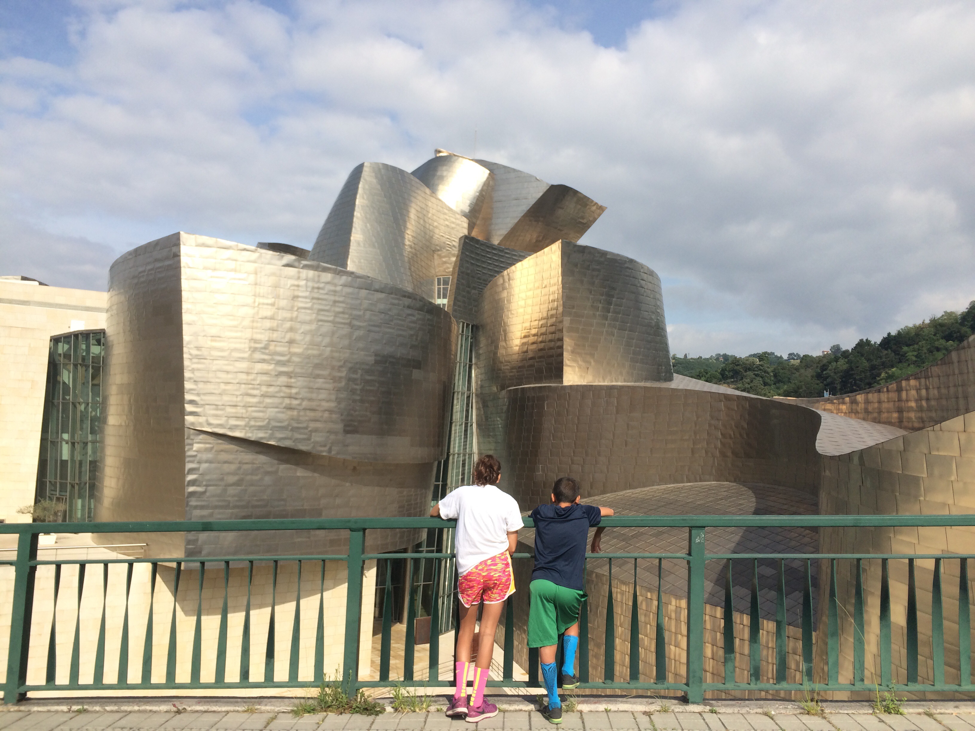 In general, I’m not a fan of buses. Don’t care to ride them, even if it’s to the neighboring town for a football game. But in Europe, the scenery trumps all that. With Karen not feeling well, the kids and I walked to the bus station and hopped on for a 1 hour trip to Bilbao. The ride was beautiful, as the highway weaved through the mountains passing farms and lots of grazing animals. The final approach to Bilbao was pretty industrial, but once we got off the bus, and started walking, the scenery changed. We passed the beautiful and relatively new soccer stadium before finding our way to the river walk that led us to the Frank Gerhy designed Guggenheim Museum.