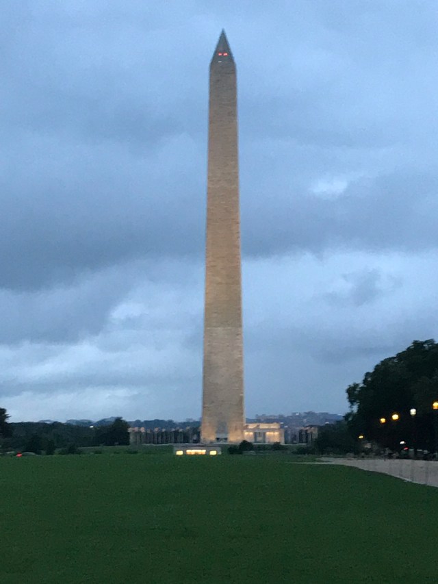 Dinner at Del Friscos Grille and then a twilight walk in the rain to the Washington Monument. We were soaked from a day of siteseeing in the rain, but otherwise a good start to the trip!