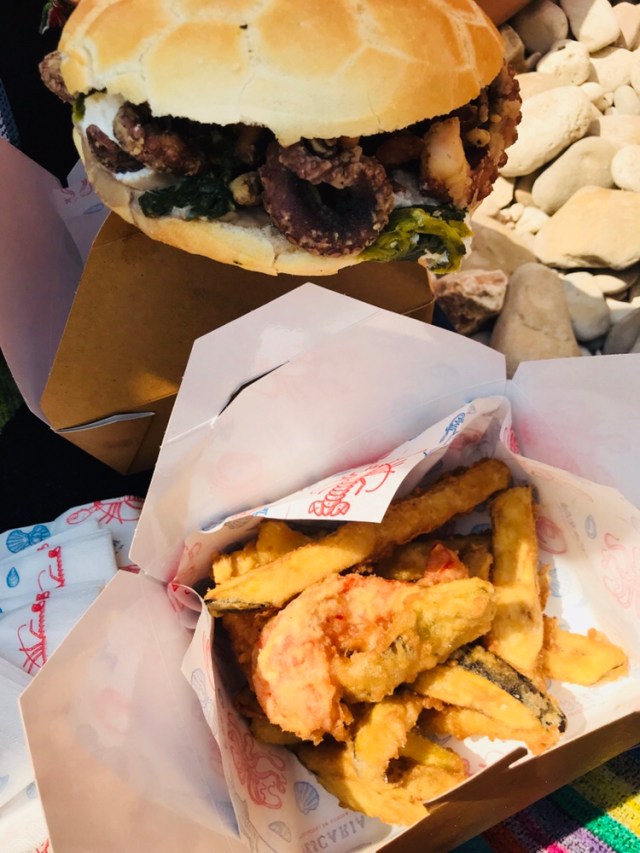 For lunch, Paul waited over an hour to get takeaway fish from the popular La Pescaria: fried octopus sandwich, homemade chips, fried vegetables, and I had a grilled swordfish burger with parsley, tomato, fresh mozzarella, cappicola, basil pesto, chopped pistachios, lemon oil…it was delicious. The kids had pizza leftovers, some snacks we brought from Alberobello, and they split a ham, tomato and cheese sandwich we bought near the beach. Neither kid wanted the focaccia with green olives and roasted tomatoes.