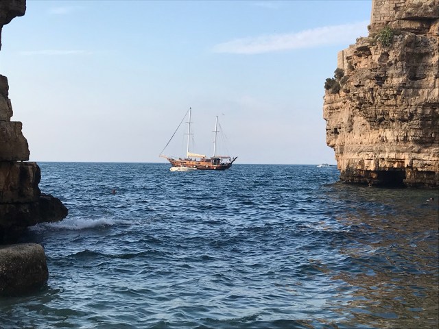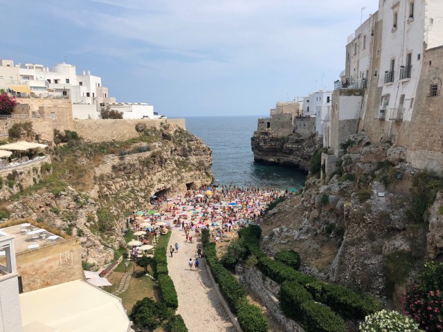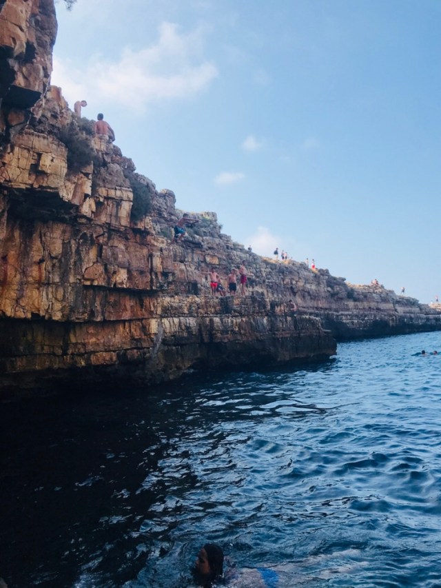 Today we did something we’ve all wanted to do since planning this trip: cliff diving in Polignano a Mare. Polignano a Mare is known as “the pearl of the Adriatic” and it is indeed a gem. A 40 minute drive from Alberobello brought us to the beach town packed with people. We went to the popular spot that Paul had researched before the trip. It was called Spiaggia Cala Porta Lama Molachile, and it didn’t disappoint.