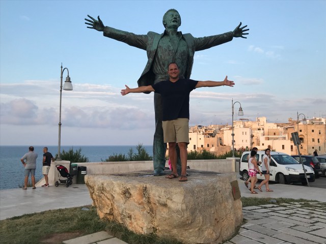 We changed clothes and walked around the old town, enjoying some gelato. We also saw the statue of Polignano’s most famous son, Domenico Modugno. You may not know his name, but you know the song he composed, “Volare”.