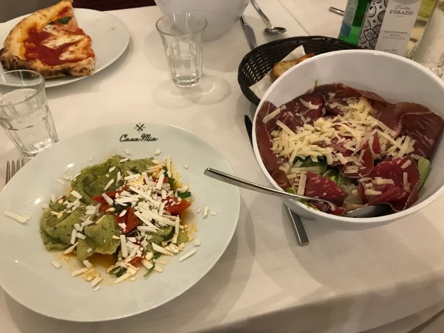 We settled in for dinner at Casa Mia in one of the main piazzas. Miss M and I had salads, Big D with a Margherita pizza and Paul with stuffed pasta with cheese and tomatoes.