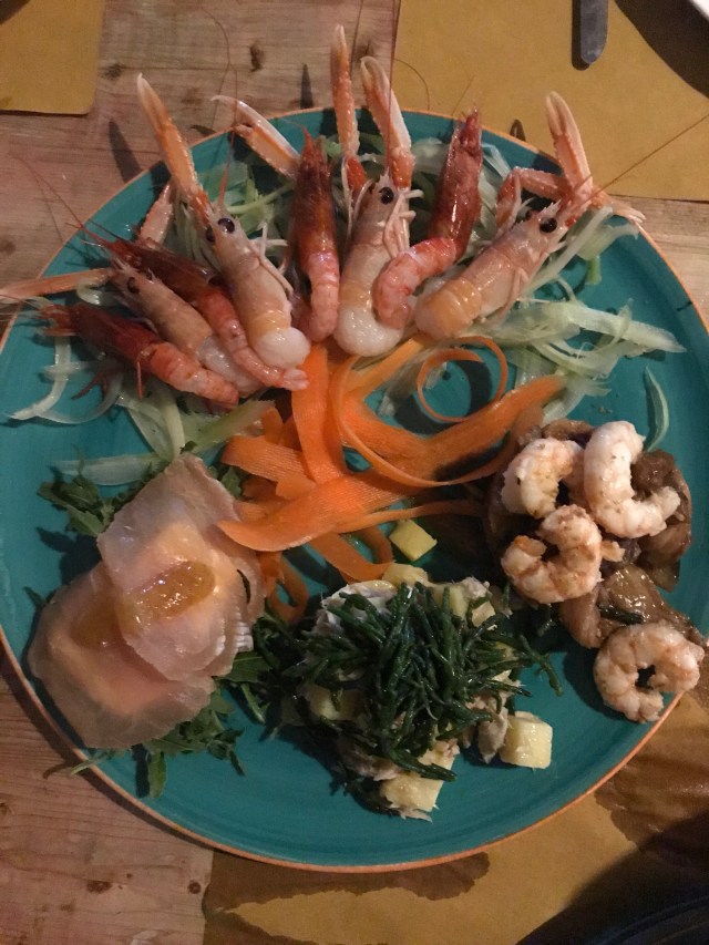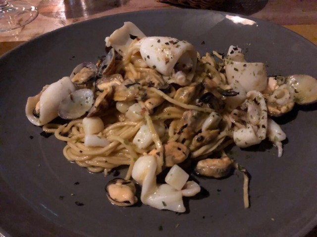 Dinner tonight was at Soul Food. Don’t let the name fool you — the soul food is Italian seafood. We started with the raw and smoked appetizer plate which included shrimp over a bed of eggplant, tuna and potatoes, smoked langoustines and shrimp, and some type of raw fish over local cheese. It was very fishy but Paul and I enjoyed it. Big D had mezzo pacchero (pasta with pesto, tuna and roasted tomatoes), Miss M had a salad, Paul had spaghetti with clams, mussels, sepia and calamari, and I had fried calamari.
