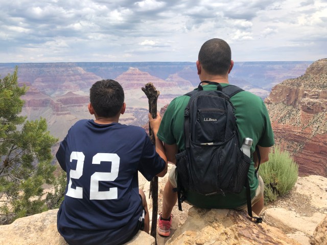 Woke up early Saturday morning to get some hiking in before it got too hot. Before 8am we were heading down Bright Angel Trail, dodging piles of mule poop and geckos and flying bugs. By 9:15am Miss M and I were done; she had enough of the bugs and while I kept wanting to walk down, I was concerned about how strenuous it would be to hike back up. Along the trail we met hikers on their way back up the canyon after spending the night at the bottom, and a couple introduced us to eating fresh currants. Paul and Big D returned to the rim 90 minutes later having made it down to the layer where the rocks turn red.