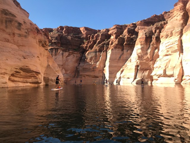 This morning we went paddle boarding on Lake Powell. Thumbs up to Max from Lake Powell Paddleboarding who patiently taught some of us (me) the basics while giving space to more experienced borders (Miss M) and allowing energetic boys (Big D) to fall deliberately off the board into the cool water over and over again.