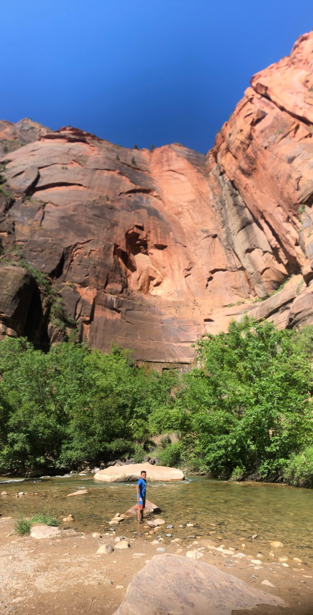 Today we slept in until 7:15 – it felt late after all the early morning starts we’ve had. We took a shuttle bus from our hotel to the Zion National Park entrance, and then another shuttle bus through the park until we reached the site of today’s hike — The Narrows.