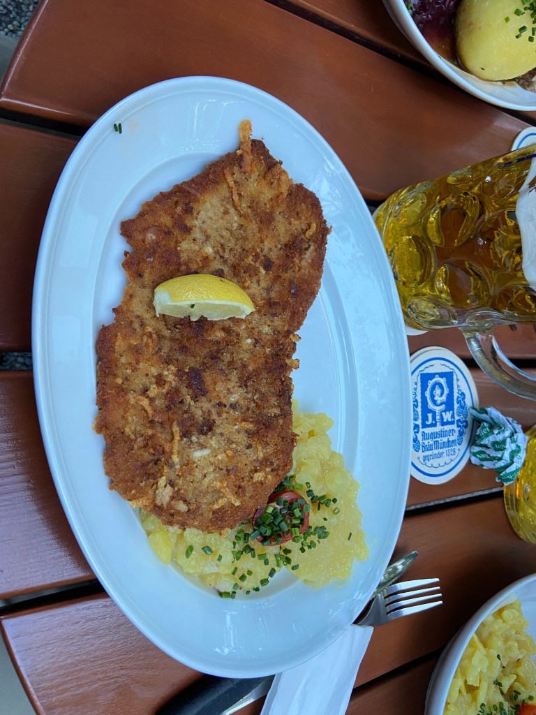 The kids briefly rested while Paul and I enjoyed a few half liters (and a pretzel) at a nearby bar. Then we went to Augustiner-Keller, an outdoor beer garden recommended to us by a former coworker. Cheese filled sausage with potato salad for me, schnitzel for Paul, some type of roast pork with gravy for Big D, fries for Miss M, and liters of beer of course. The place is huge and pics do not do it justice.