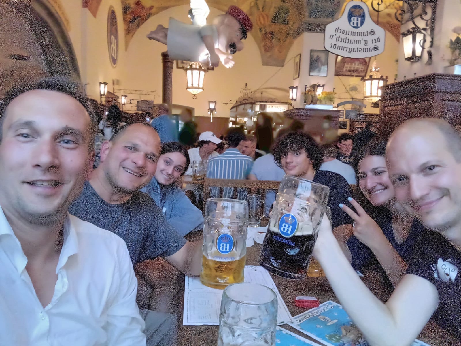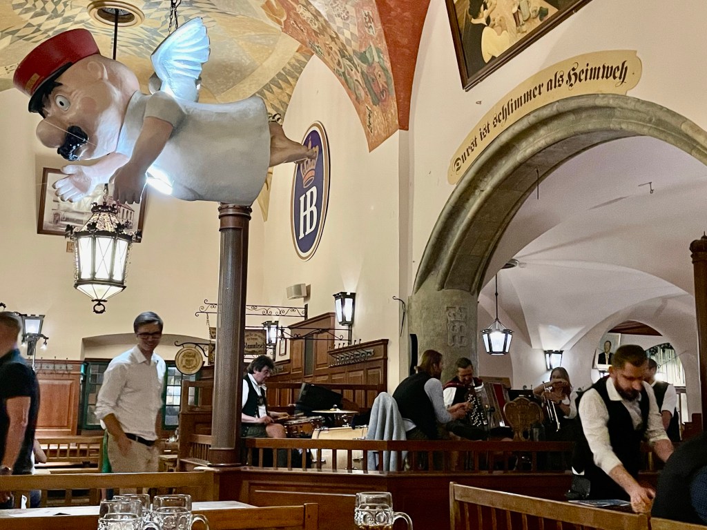 At night we went back to the Hofbrauhaus where Big D had apple strudel, Paul had schnitzel, Miss M had a pretzel, and of course more beer all around (except for Miss M.) While it’s full of tourists, it has a place in German history with Hitler and the National Socialists hosting their first meeting in the upstairs hall. Long shared tables that seat 10-12 so socializing with others at your table is expected. Last night we spent 4-5 hours with Stefan and Dirk who live outside of Frankfurt and were spending a few days away from their wives and kids. They had personalized beer counters to track their consumption and were full of stories and laughs. At the end of certain songs they had us standing up, singing and toasting.