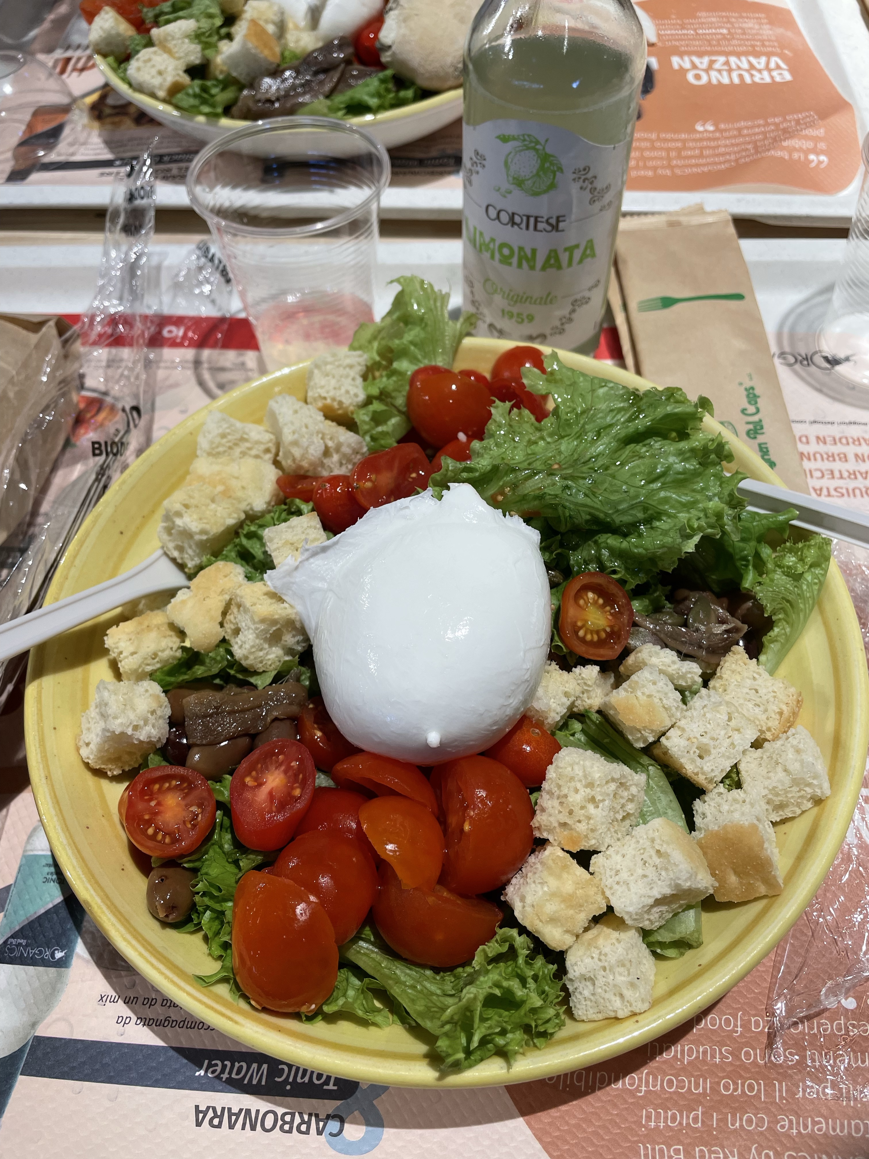 Lunch at the AutoGrill along the highway, which is a rest area shop and eating establishment on steroids. There’s always large candies and toys to buy overtired children on long car rides, but every trip to the AutoGrill has an amusing featured item on special at the entrance. Today it was a light up musical ice bucket. Lol
