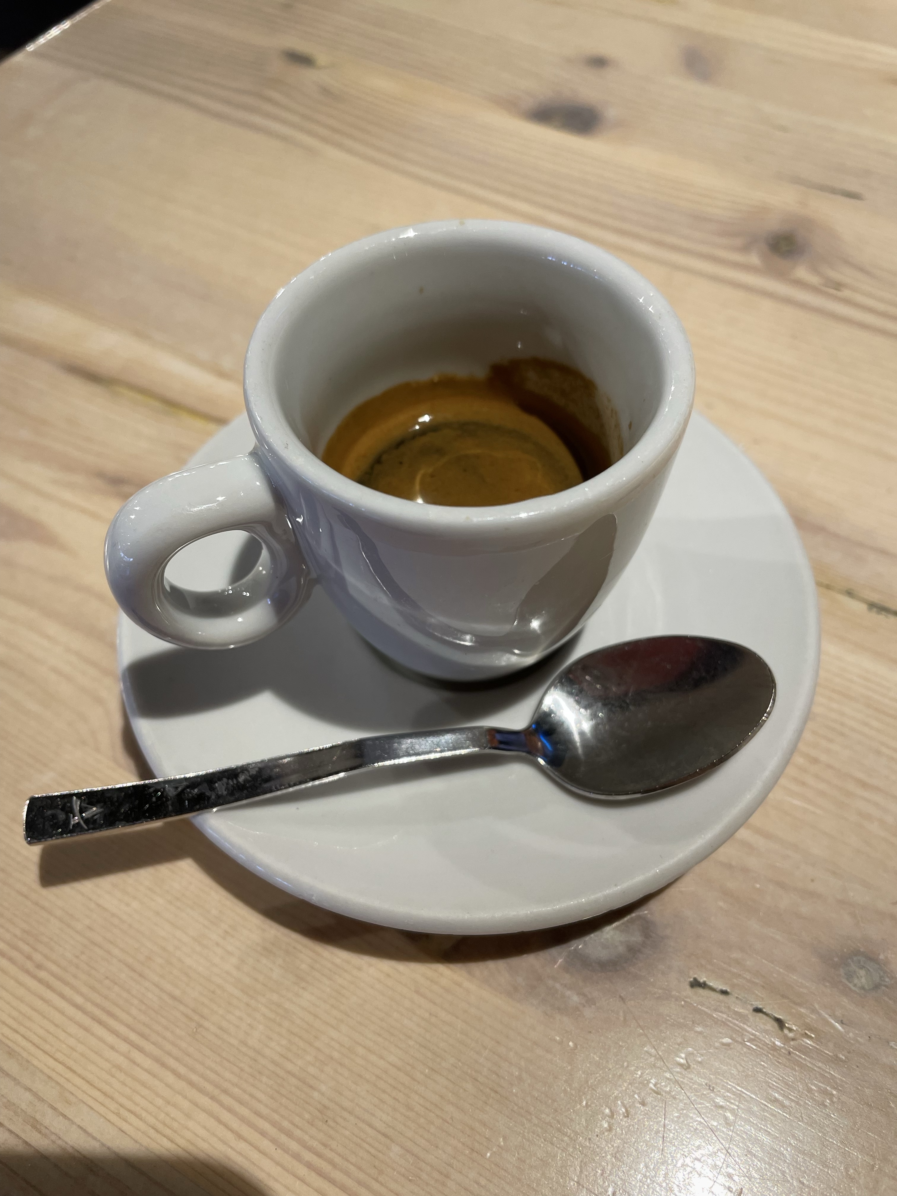 We had three salads (with anchovies, capers, tomatoes, olives, and a ball of mozzarella), cups of fruit and a small tiramisu. Miss M ordered from the pasta station. Each tray of food came with large hunk of bread with olives and a small dinner roll. And, espressos were included with lunch — note how the rest stop espresso is served in china with a real spoon!