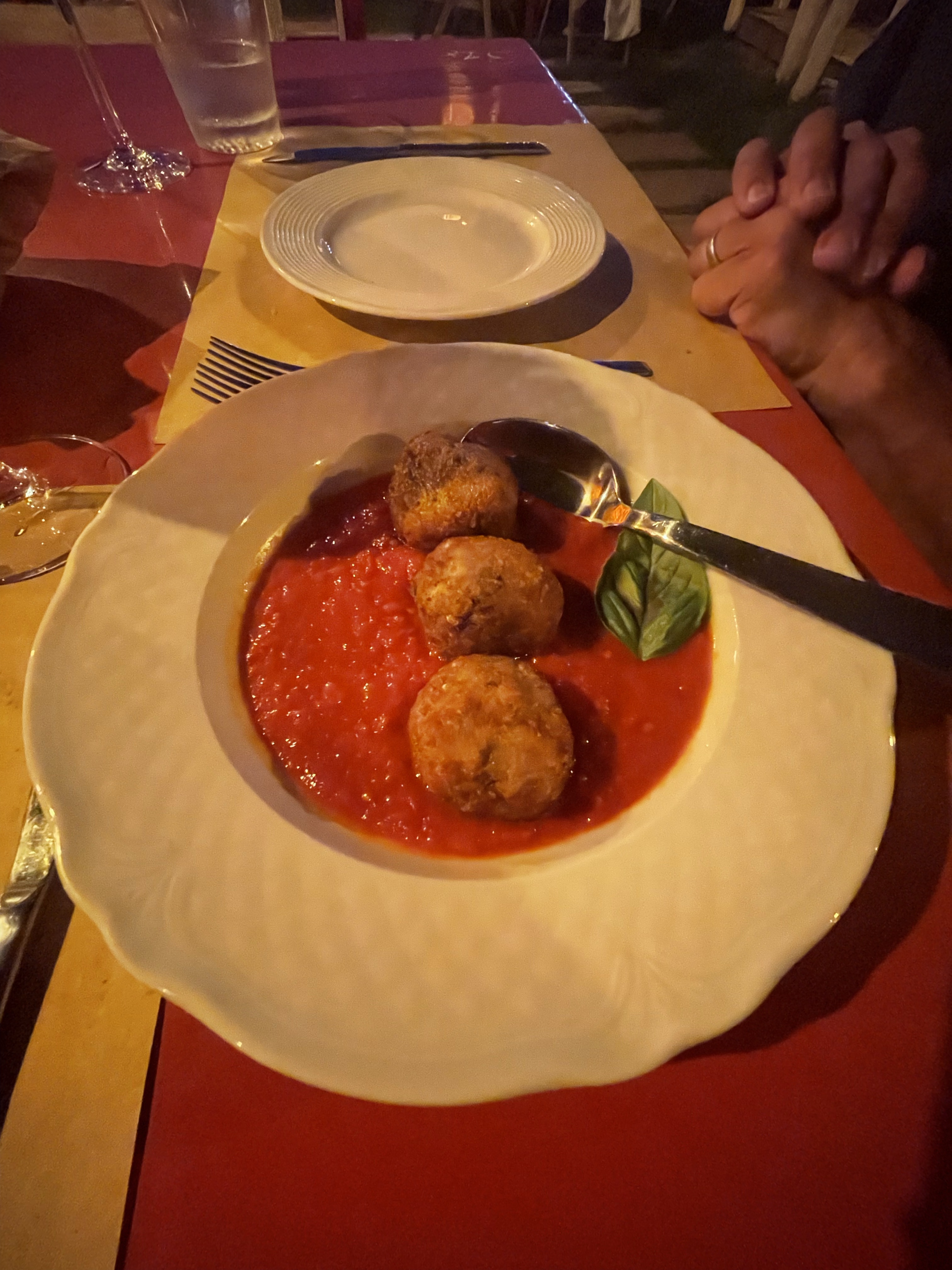 For dinner, Paul and I went to Cucino Io (which translates to I Cook.) It’s right on the water with beautiful views facing south towards the island of Zannone and the town of Terracina in the distance. We started with polpetti di alici (anchovie meatballs in red sauce), and shared a mezzo pacchero con pesce spada (large tube shaped pasta with swordfish) and frittura di calamari (fried calamari that was very light and tender.)