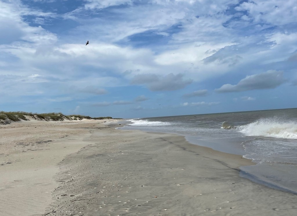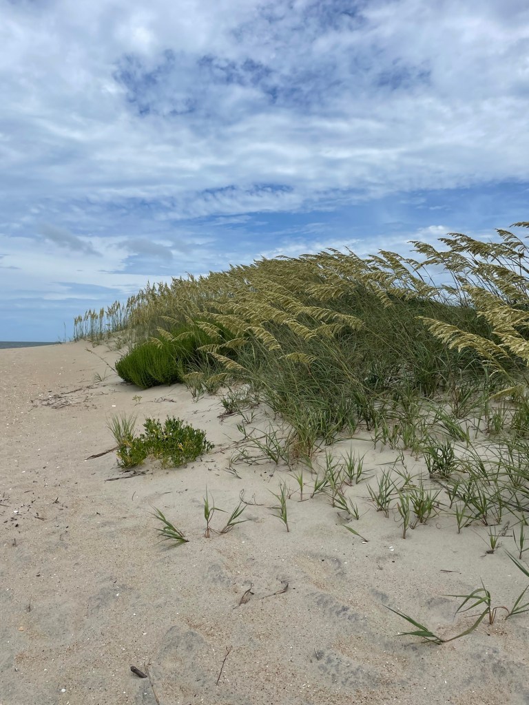Sixth stop, further down the Cape Hatteras National Seashore, we passed a vast nature preserve but then spotted a place to legally park the car and climb between the dunes to get to the ocean. It was very windy with the sand pelting our exposed skin, but it was quite empty and serene.