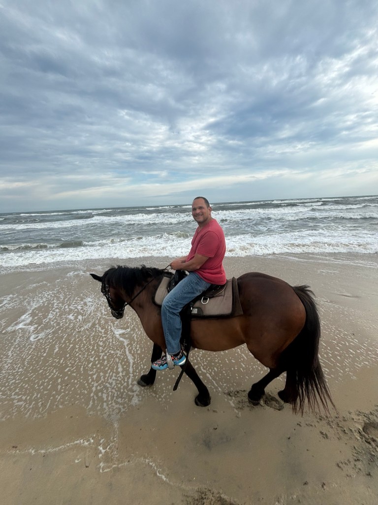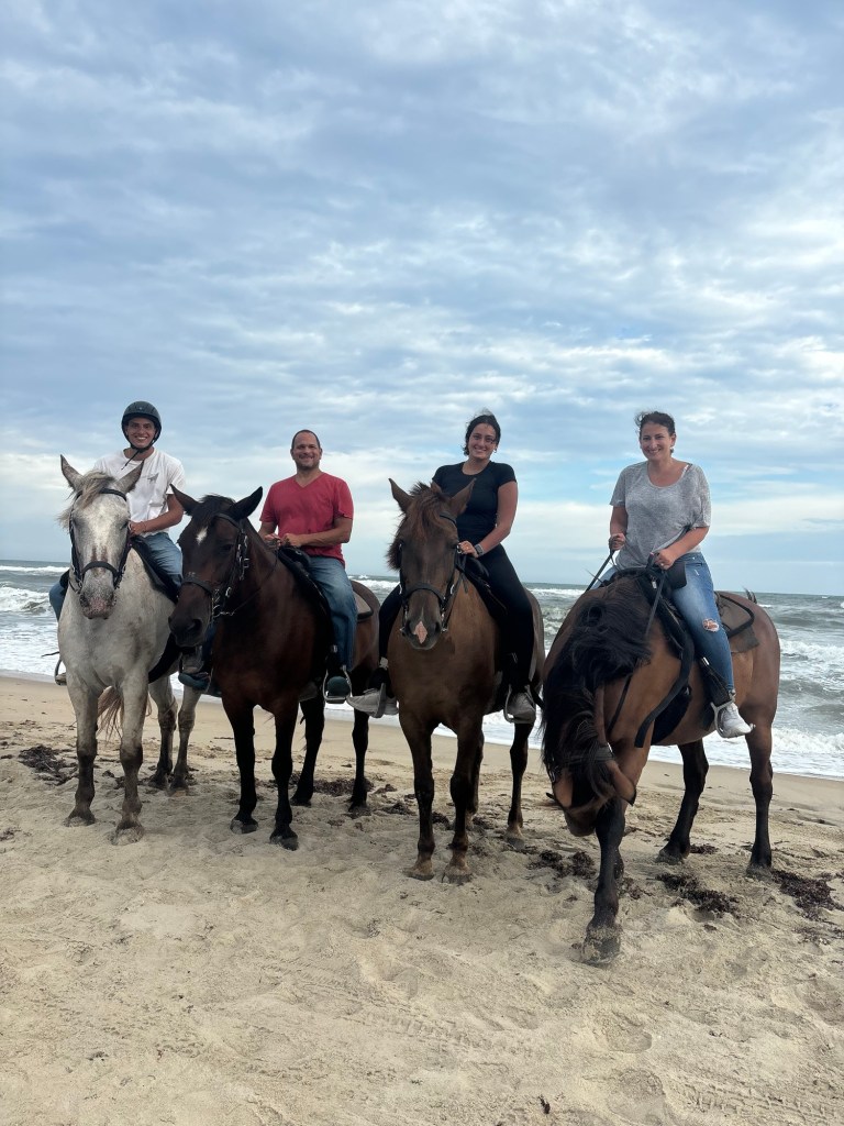Finally we reached our eighth stop: the town of Frisco on Hatteras Island. In Frisco we did a two hour ride through the Buxton Woods maritime forest and onto the beach with horses! My horse, Madison, passed gas a lot and was smitten with another horse so she got easily distracted. Miss M is a natural born equestrian and did very well with her horse, Reba. D kept trying to get his twenty year old horse, Amos, to trot faster and NC law said he needed to wear a helmet since he’s under 18 so we had fun with that. Paul’s horse, Birdie, was a follower and just wanted to mimic Amos. We spent 2.5 hours with the horses and enjoyed every minute of it.