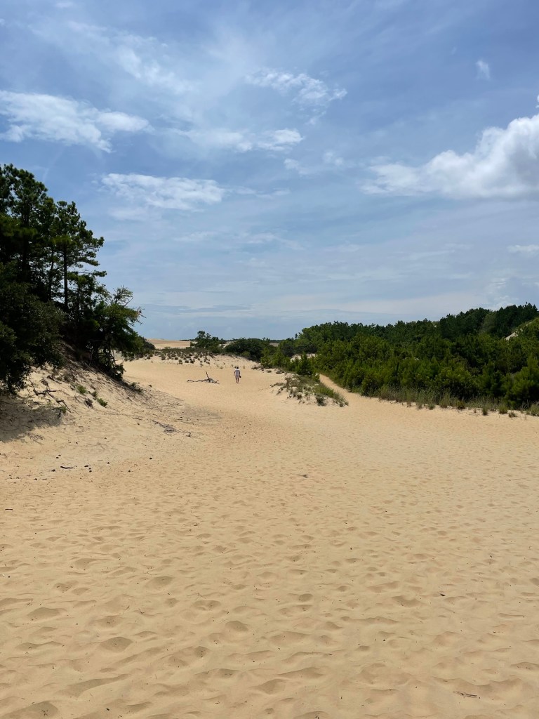Third, in the town of Nags Head, Jockeys Ridge state park with North Carolina’s tallest sand dune (100 feet) where people can parasail, hike the trails, go sandboarding. It was too hot so I bailed after 100 yards but the boys went further than me to checkout the landscape.