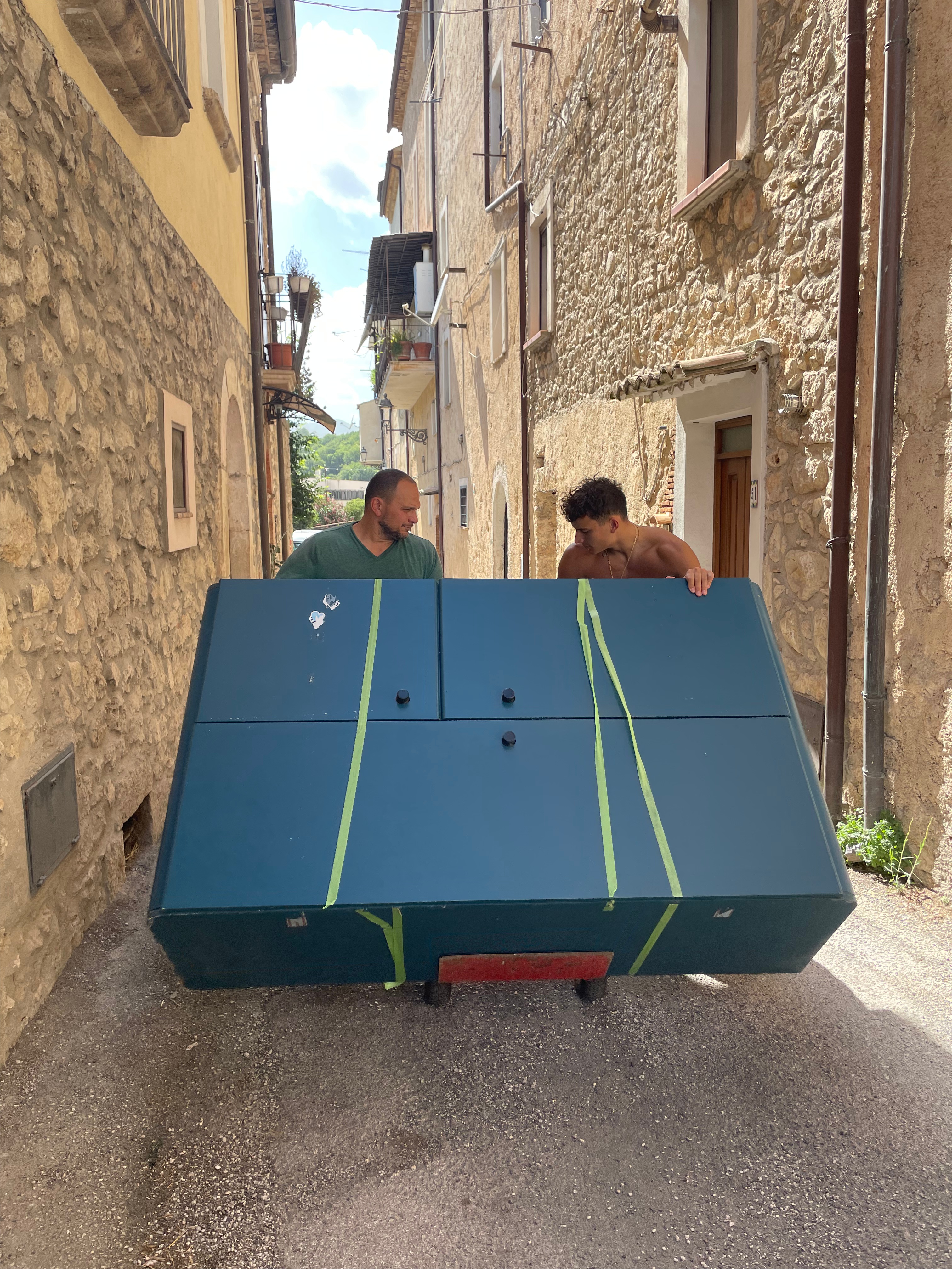 This afternoon the boys moved a large blue wardrobe and the base of a convertible chair/bed into the cantina until we can figure out how to do large item or bulk trash pickup. The cantina is the size of a single car garage but the door is only wide enough for a Vespa or motorcycle. We’re using it as storage space for now and our friend’s motorcycle is parked there as well.