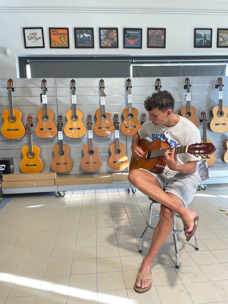 We promised D he could keep an acoustic guitar at the house, so off to Drums & Music in nearby Ceprano we went. Tiziana was excited to hear about the pending guitar purchase and asked if D could play to help lull customers in for a spritz.