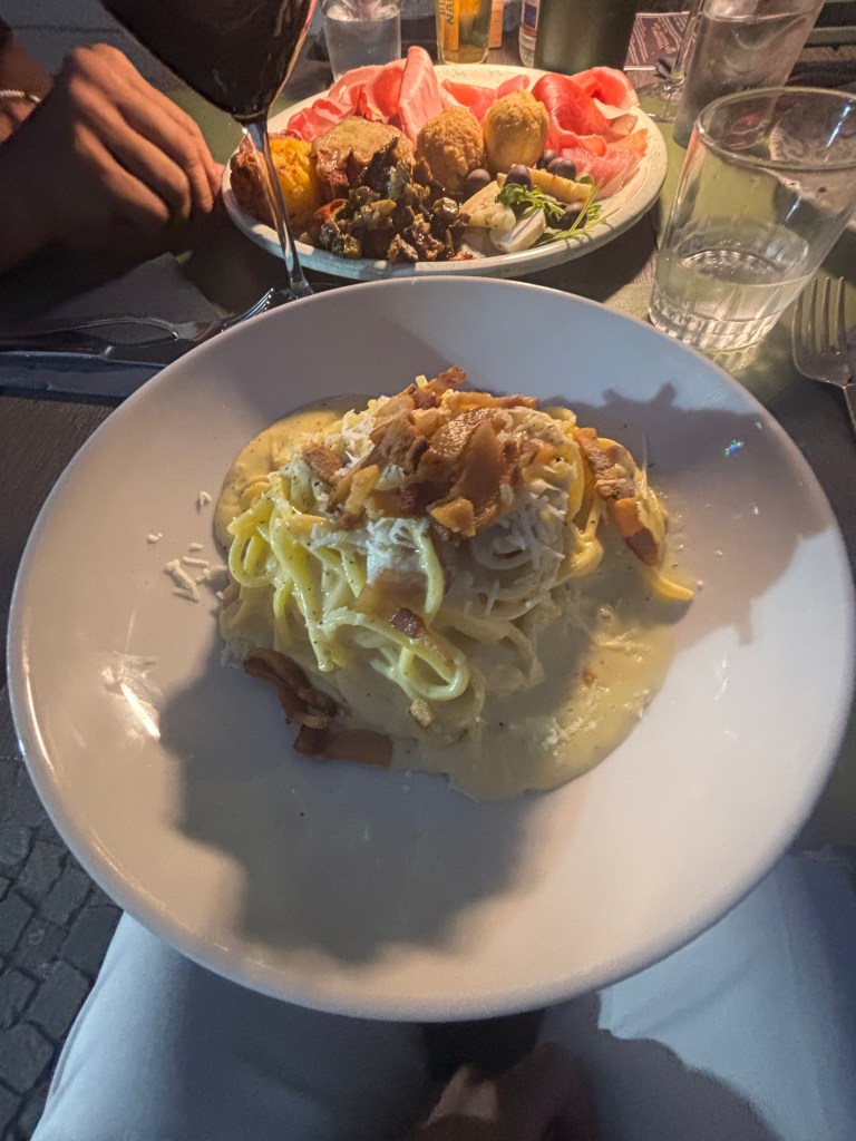 The chef has won numerous awards, including a best pizza award from a global competition in Vegas, and an award for their spaghetti carbonara. Tonight we had spaghetti carbonara (it was soooo good), an antipasto platter, and three pizzas: fig and prosciutto, amatriciana and magnola which had two cheeses and prosciutto crudo.