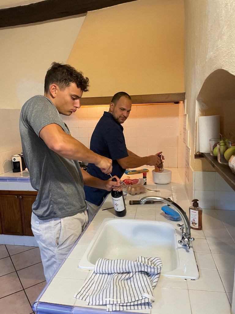 As Paul prepped dinner for us, the boys tried to open a bottle of red wine without an opener. When the cork finally went into the bottle, via hammer and screwdriver, the force was so strong that wine went everywhere — onto the freshly cleaned floor, fridge; walls, and ceiling. We’re so done with cleaning today that we’ll just remove the wine from the ceiling tomorrow!