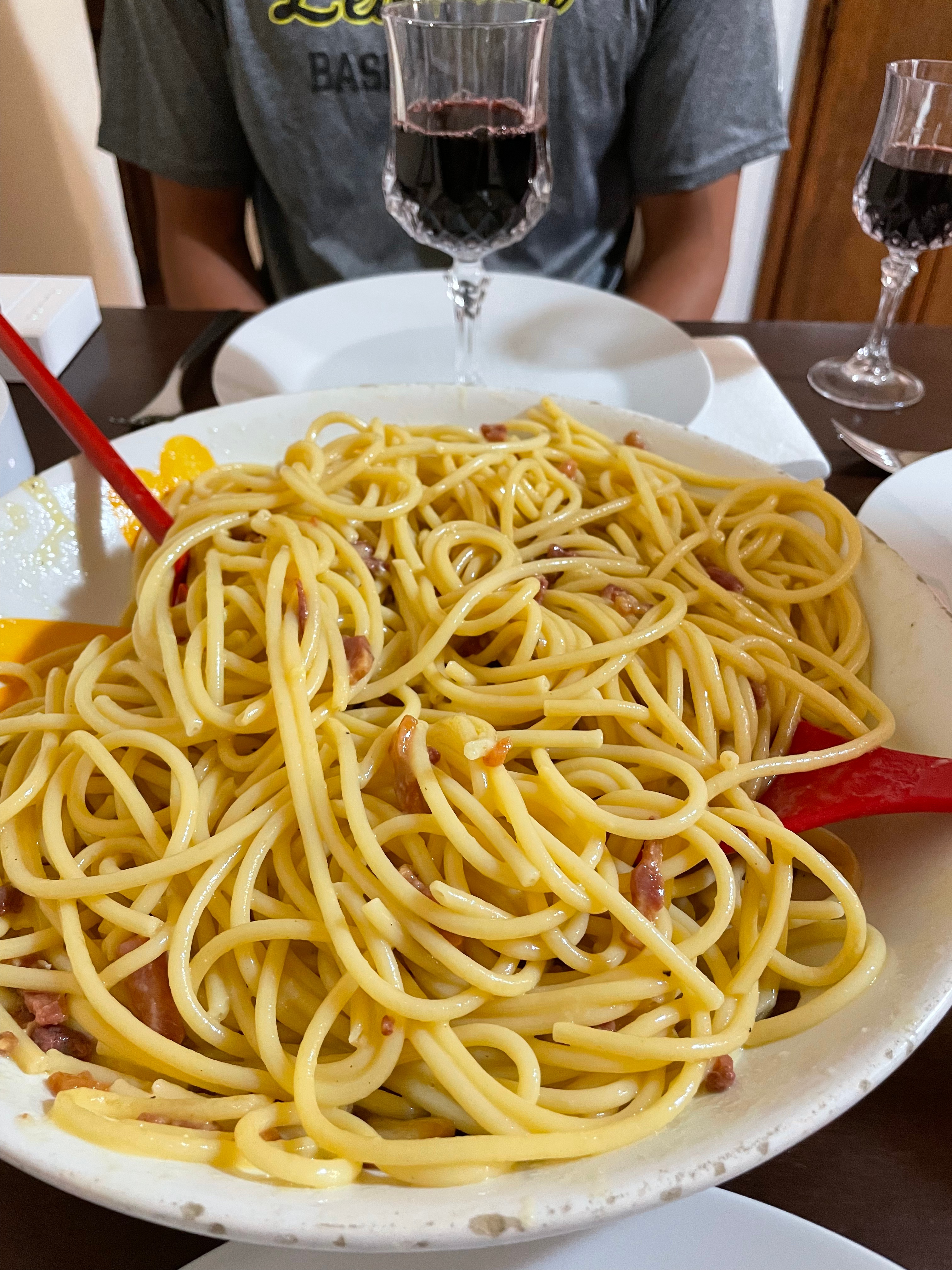 Paul prepared bucatini alla carbonara with quanciale (thick spaghetti in an egg and cheese sauce with bits of pig cheek.) We didn’t have a pasta strainer and we employed D to manually crush the peppercorns since we didn’t have a grinder. We also don’t have any food storage containers for the leftovers so we’re improvising. I’d say overall first dinner at La Casa Pico was a success!