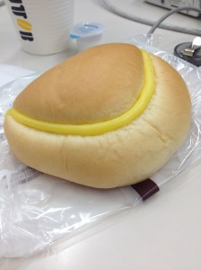 Family Mart is also where I purchased two items for lunch yesterday since by the time I was done with meetings the cafeteria had closed. First, a triangle of rice wrapped in seaweed — I forget the name of this popular snack. The packaging is ingenious…you unwrap the snack and there are thin pieces of plastic separating the dried seaweed from the moist rice. When you pull out the thin pieces of plastic, the seaweed adheres itself to the rice allowing you to eat it “fresh” without the seaweed getting soggy.